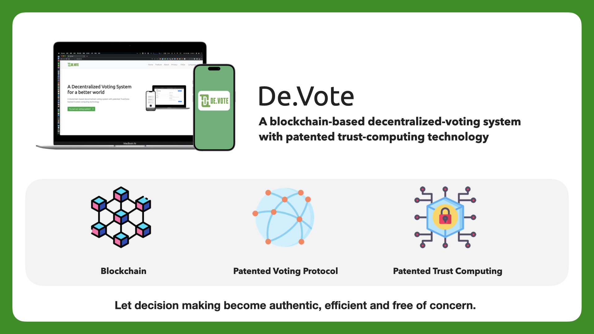 The development of De.Vote involved a meticulous balance between usability and advanced security features. My leadership in the project led to the implementation of our services for industrial clients and the development of an innovative proxy voting method. This method effectively balanced usability with security, resulting in a patent in Taiwan. The impact of De.Vote is far-reaching, as it offers a practical, secure, and user-friendly solution to the challenges of traditional voting systems, ensuring greater participation and trust in the democratic process.